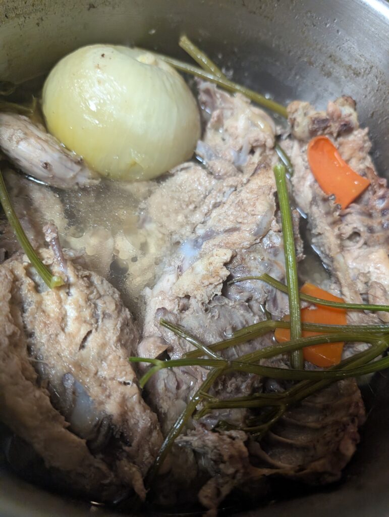 しばらくすると鍋の中では、玉ねぎの甘さがほどけ、人参の香りがにじみ出し、骨の奥に潜んでいた旨味が目を覚ます。