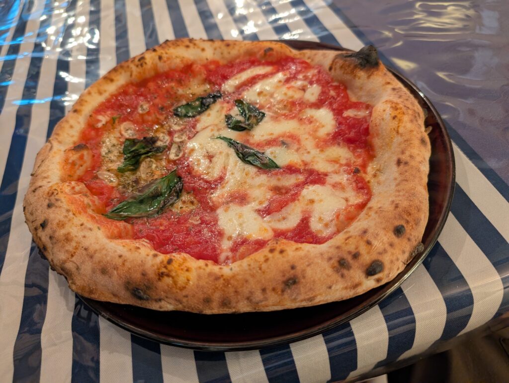 運ばれてきたピッツァ・マリナーラとマルゲリータのnハーフ&ハーフを約5分で食べ、お会計を。